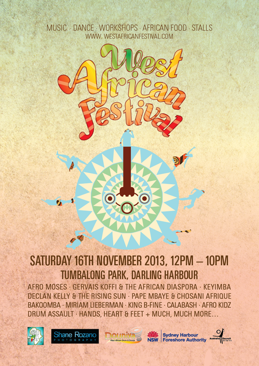 Commissioned to design the posters, flyer, banner for the website(social network materials) and t-shirts for the West African Festival 2013. The design has developed from last year's concept, also taken the element of the West African masks design. The chosen idea was based on Mossi sun mask design from West Africa. The final design was developed from the idea of the West African mask design and the silhouettes of the artists performance in the festival.
